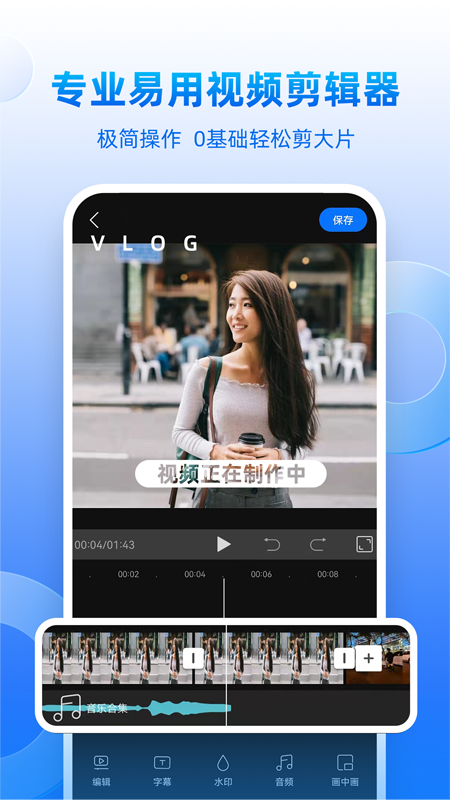 专业视频编辑功能,分钟之内即可完成视频剪接、音频更换、视频拆分、视频加字幕、画中画、视频加音乐、比例更改、倍速调整、视频倒放等操作,vlog视频制作就用创客贴。