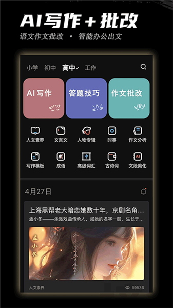 高考中考范文、高分写作模板、热门时事、报纸金句、常用成语、引经据典等等。让你的写作灵感翩翩起舞。