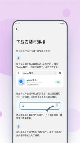 若旧手机非Moto安卓设备:下载安装【Moto换机App】,打开后选择Android选项并扫描新手机的二维码设置。