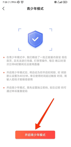 点击【开启青少年模式】,根据提示完成验证即可生效。