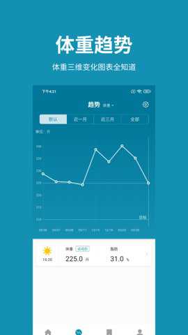 1、用户可以每日记录自己的体重数据,软件根据每日的体重趋势变化形成一个体重趋势图,从而了解自身的体重变化和身体的状态。