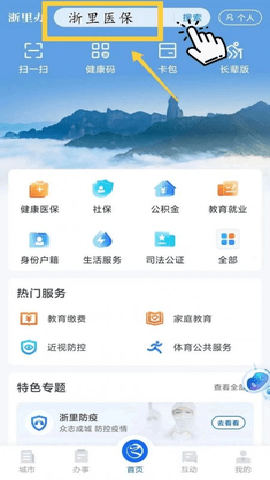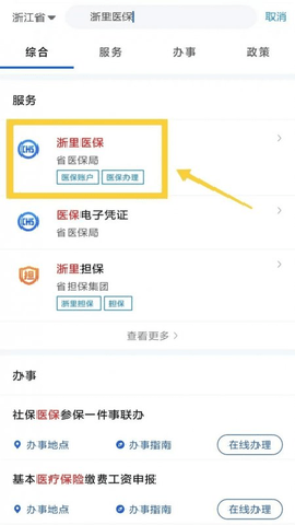 第一步:请您打开浙里办APP,在首页顶端搜索框内输入浙里医保,点击搜索按钮。