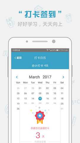 打卡日历:每日签到,记录学习情况,通过考勤,督促用户坚持学习。