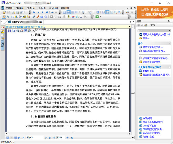 中国知网CAJ全文浏览器支持查看caj、teb、kdh、pdf等众多格式的浏览器;可以对文字显示效果以及排版进行自定义设置;提供直接打印、保存功能,支持*.caj/kdh/nh/pdf等格式输出。 软件功能