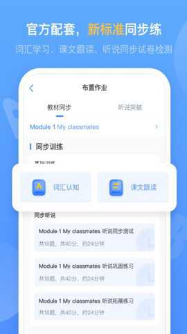 外研优学老师版是外研ai教师的专属app,内置有作业布置,检测、练习考试等功能,且实时与教材同步,一键布置,操作起来更加的便捷!