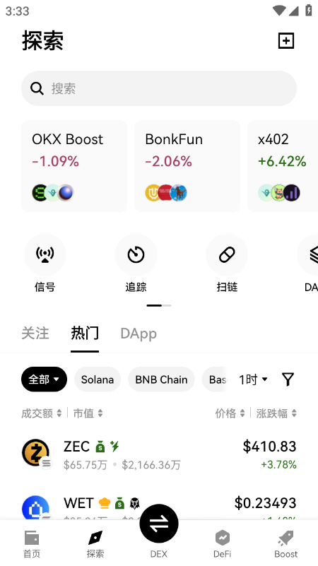 多链Web3钱包:内置非托管钱包,支持30+公链,用户可自主管理私钥,直接进行转账、兑换、连接DApp等操作。