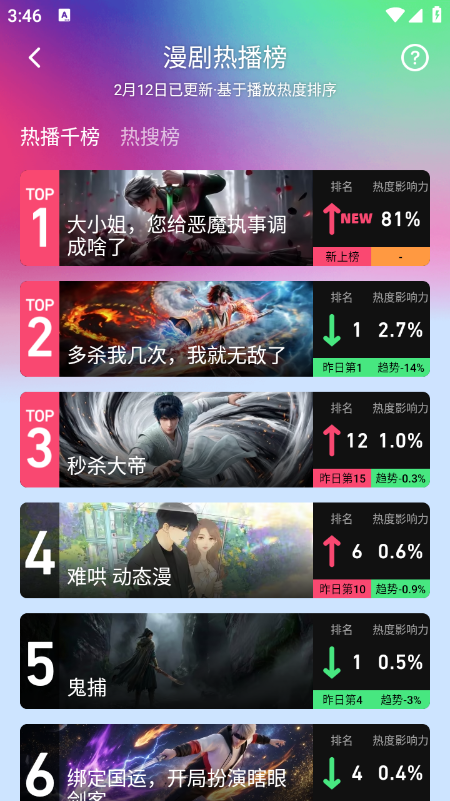 5、内置热播榜、热搜榜等榜单,实时展示热门漫剧排名、热度趋势。