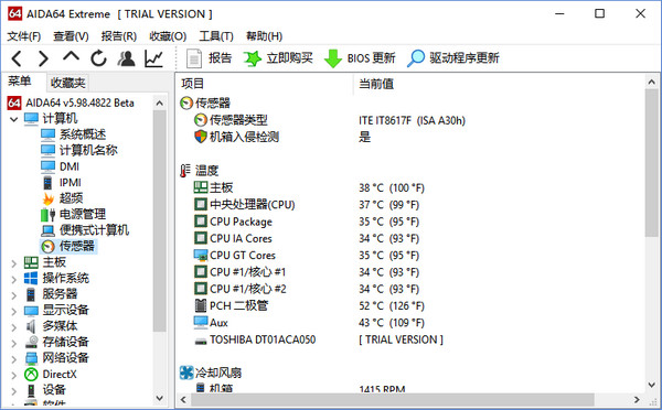 AIDA64 支持超过150个的各种传感器设备来测量温度,电压,风扇速度和功率消耗。测量值可显示在系统托盘图标,OSD面板,边栏小工具,和罗技G15/G19游戏键盘LCD。的值也可以被记录到文件或出口到外部应用程序,如RivaTuner中或武士。 AIDA64也可以报警用户,当它检测到过热,过电压,或冷却风扇故障。