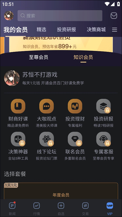 知识会员的功能略低于至尊会员,所以所能享受的服务也会略低于它,当用户开通这款vip服务后,软件内许多的精品财商课都能免费的观看了,这对于个人未来的发展来说是非常有利的,也能拓展个人的见识;随后就是大咖观点了,用户也能查看来自于港美股市的各种大拿进行的大师课,让用户站在更高一层的山峰去进行分析思考,体验大师对市场的理解,听上去是不是很奇幻,相信我,体验过后对自己未来的思考方式和发展也有更好的方向;最后还有一个投资理财功能了,这个功能能够很好帮助你规划你的投资,是一款非常实用的功能。