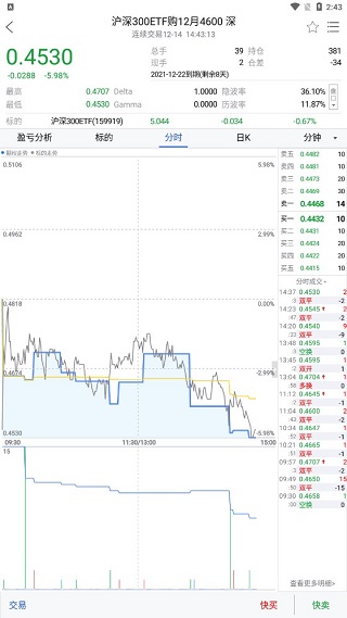 (3)多处交易细节设计,确保交易顺畅,包括下单页面快速切换上下两档期权,快速微调价格和数量,撤单时可选择撤买、撤卖、全撤,快捷反手,自动拆单,多种下单面板风格自由选择等。