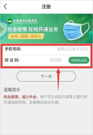 1、打开甘肃农信掌上银行app,点击首页登录界面的“注册”按钮,进入客户自助注册流程。2、填写注册手机号码(与银行预留手机号码保持一致),获取短信验证码。若您已开通掌上银行,将提示您直接登录;若未开通掌上银行,点击“ 下一步”。