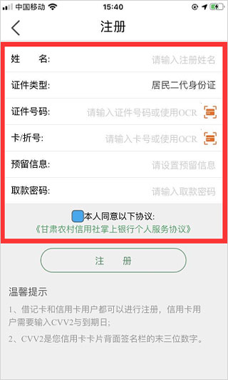 3、填写客户姓名、证件号码、绑定的银行账号、取款密码,勾选《 甘肃省农村信用社掌上银行个人服务协议》,点击“注册”。