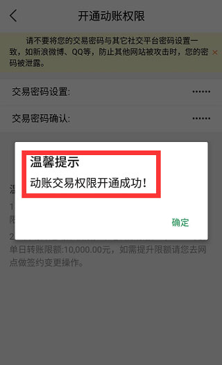 5、设置并确认掌上银行交易密码,点击“确认”后即可 开通动账权限。
