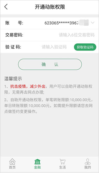 7、输入掌上银行交易密码和短信验证码,点击“确认”后即可开通动账权限。