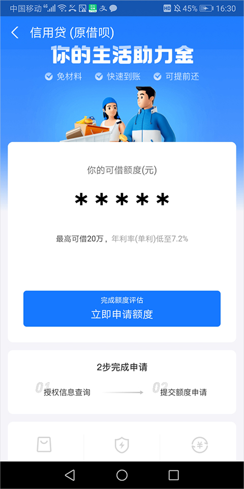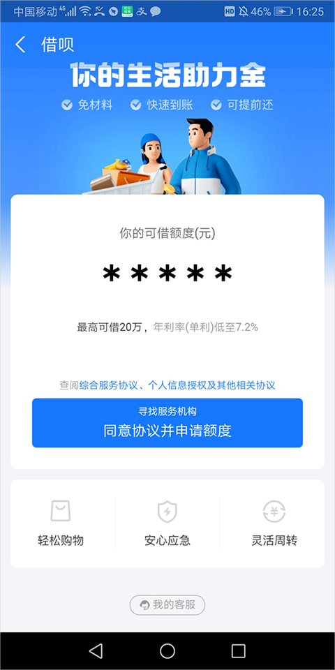 背靠支付宝品牌信用为用户提供安全小额借款,并且极速申请,可当天进行放款