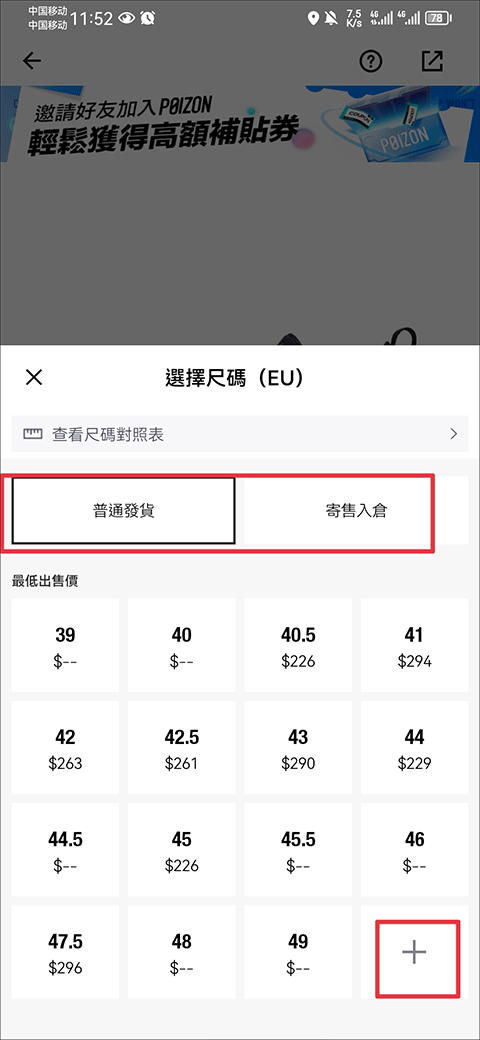 4、接着就是选择发货方式和鞋码,例如普通发货,若没有显示你要出售的鞋码,可以点击下方+号进行添加