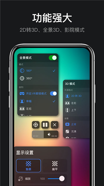 1、rPlayer可以将任意格式的视频,转成vr或者3d模式播放,只需要一个普通的vr头戴设备,就能以沉浸的方式观看所有视频。