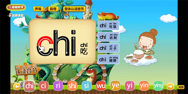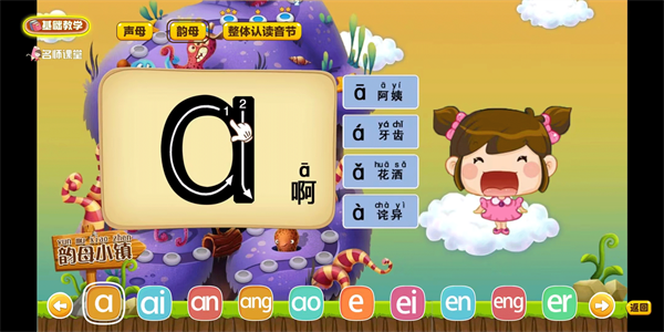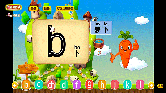 以生动有趣的动画形式开展教学,每小节聚焦一个拼音及其对应的常用生字,结合笔顺书写与标准发音,实现看—听—写—读”一体化学习。