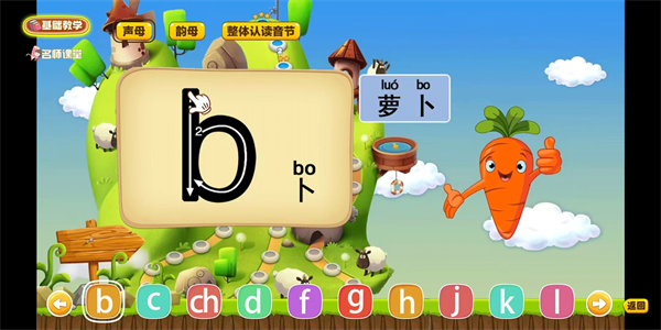 动画引导孩子同步学习拼音书写,规范笔画顺序,提升书写能力;融合拼音发音与常见词语学习,实现拼音与识字同步推进,丰富语言积累。三、名师带你学拼音