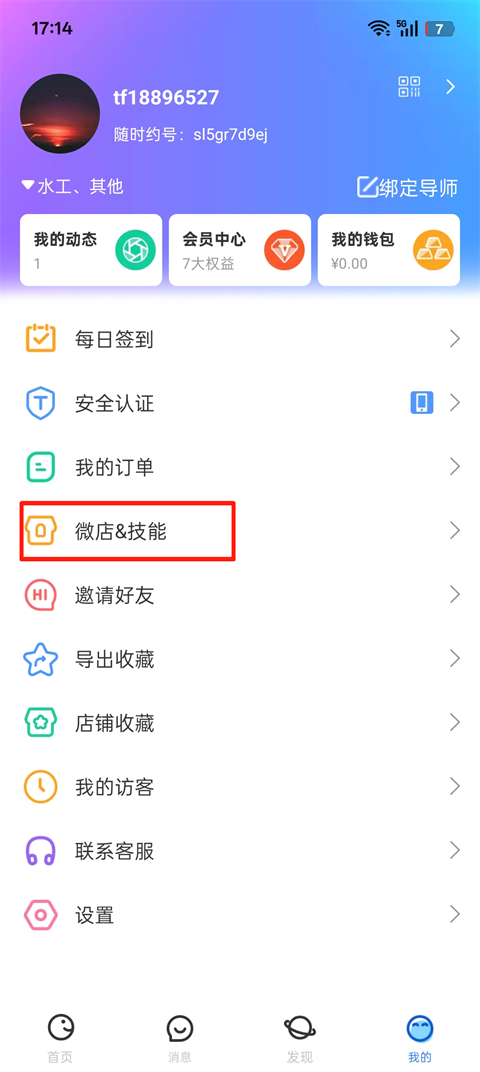 2、进入个人中心后,选择【微店&技能】选项