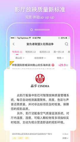 1、平台会根据用户手机的GPS定位,推荐最近的、周边的影院,方便用户的观影。