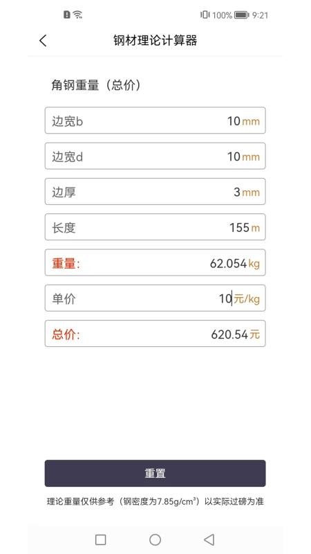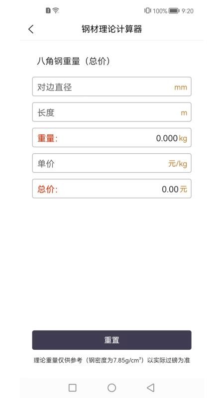 可一键重置所有数据,方便用户能重新录入数据计算,知道钢材数据更方便;
