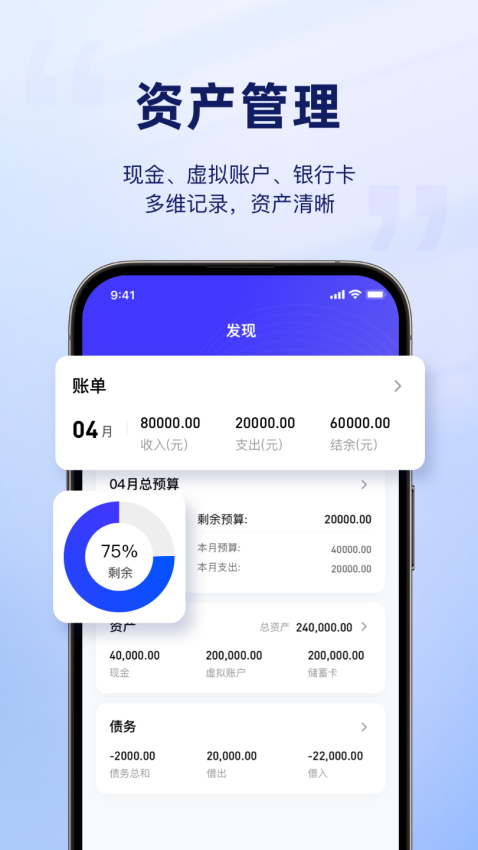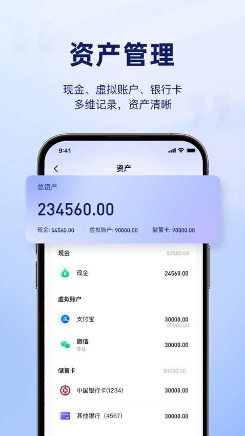 银行卡、支付宝、钱包等账户统一管理,实时计算总资产,掌握个人财务全貌。