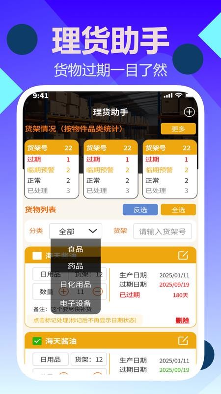 这里也会对相关的货品来进行过期提醒,进而可以实时进行智能提醒,随时标记处理。