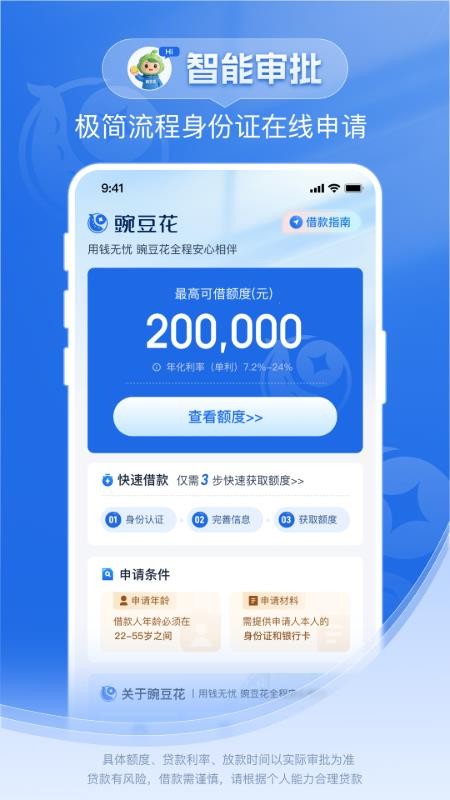 豌豆花app让用户以后的贷款变得非常轻松,无需任何复杂的操作,只需要几个步骤就可以快速贷款了,绝对可以让你的贷款更加的轻松,符合许多用户的在线贷款需求,平台采用了智能审核模式,全都是由人工智能在线进行审核,只要符合要求都会快速通过审核,让你短时间内获得贷款!