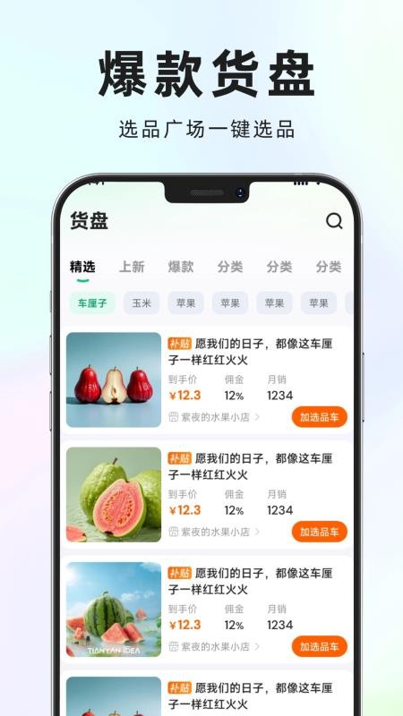 在货盘中心可以选品购物,可将各种最新最热的商品资源一键加入选品车管理。