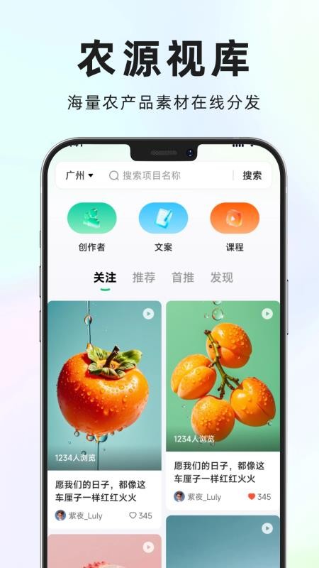 农源视库APP最新版是一款专门提供农产品短视频素材资源的软件,其中将各种各样的农产品素材资源全面推荐,让用户可以随时在这里查找到你需要的素材进行短视频创作使用,超多高清优质的素材资源可以畅享使用,助力用户轻松创作各种农产品宣传的短视频作品,同时还支持用户将常用的素材发布者一键关注,可随时关注对方的素材上新动态,获取更多更新的素材资源创作使用,其中不仅有图片/视频素材,还有着大量的文案素材可供用户任意选用,让用户创作短视频更加的省心高效,有需要的用户就快来下载农源视库官网版使用吧!