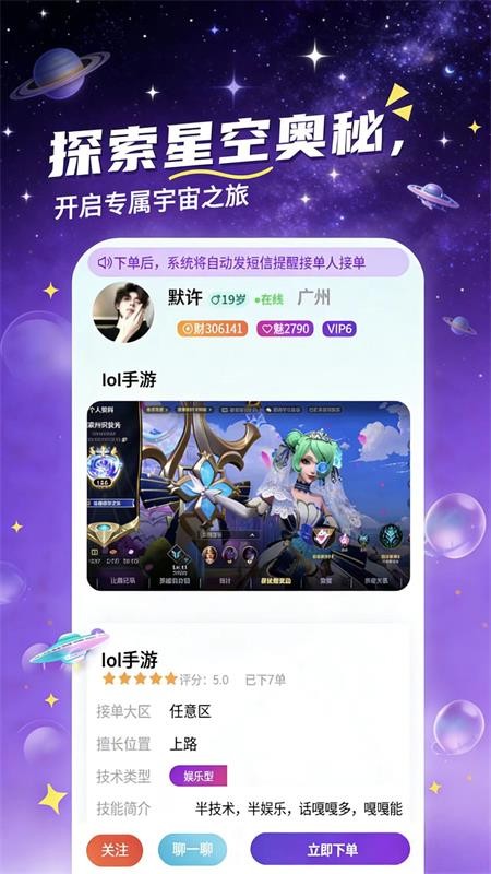 趣陪星球app让众多游戏玩家以后可以享受专业、优质的陪玩服务,以后你的游戏才会变得非常有趣,平台会不断入驻海量陪玩,在这里可以拥有更多的选择,无论是学技术、抱大腿、趣味娱乐等等都可以搞定,符合不同玩家对游戏的需求,是你最佳的游戏陪玩选择!