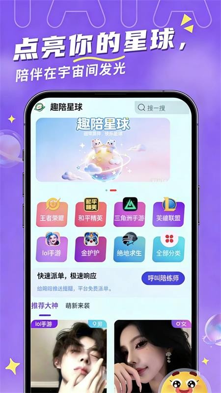 趣陪星球app官网版是一个为玩家提供游戏陪玩服务的平台,平台汇聚了海量的陪玩人员,不同类型的陪玩都可以找到,例如:技术陪玩、声优陪玩、娱乐陪玩等等,这样就可以让玩家拥有更多的选择,以后无论是提升游戏技术、提升游戏段位或者趣味游戏等等都可以在这里找到合适陪玩,满足你的各种游戏需求;趣陪星球最新版为玩家整理了不同的游戏陪玩专区,让玩家可以轻松的查看王者荣耀、和平精英、三角洲手游、英雄联盟、金铲铲等游戏的陪玩人员资料,你才可以快速找到合适的陪玩人员,让玩家能够直接在线下单,即刻享受陪玩服务,感兴趣的玩家快来下载吧!
