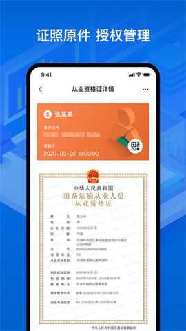 运证通用户使用本软件经过实名认证和证件申领后,即可在移动端展示相应证照